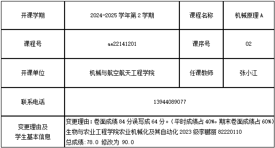 关于学院2023级李鹏丽同学机械原理A课程成绩更正的公示