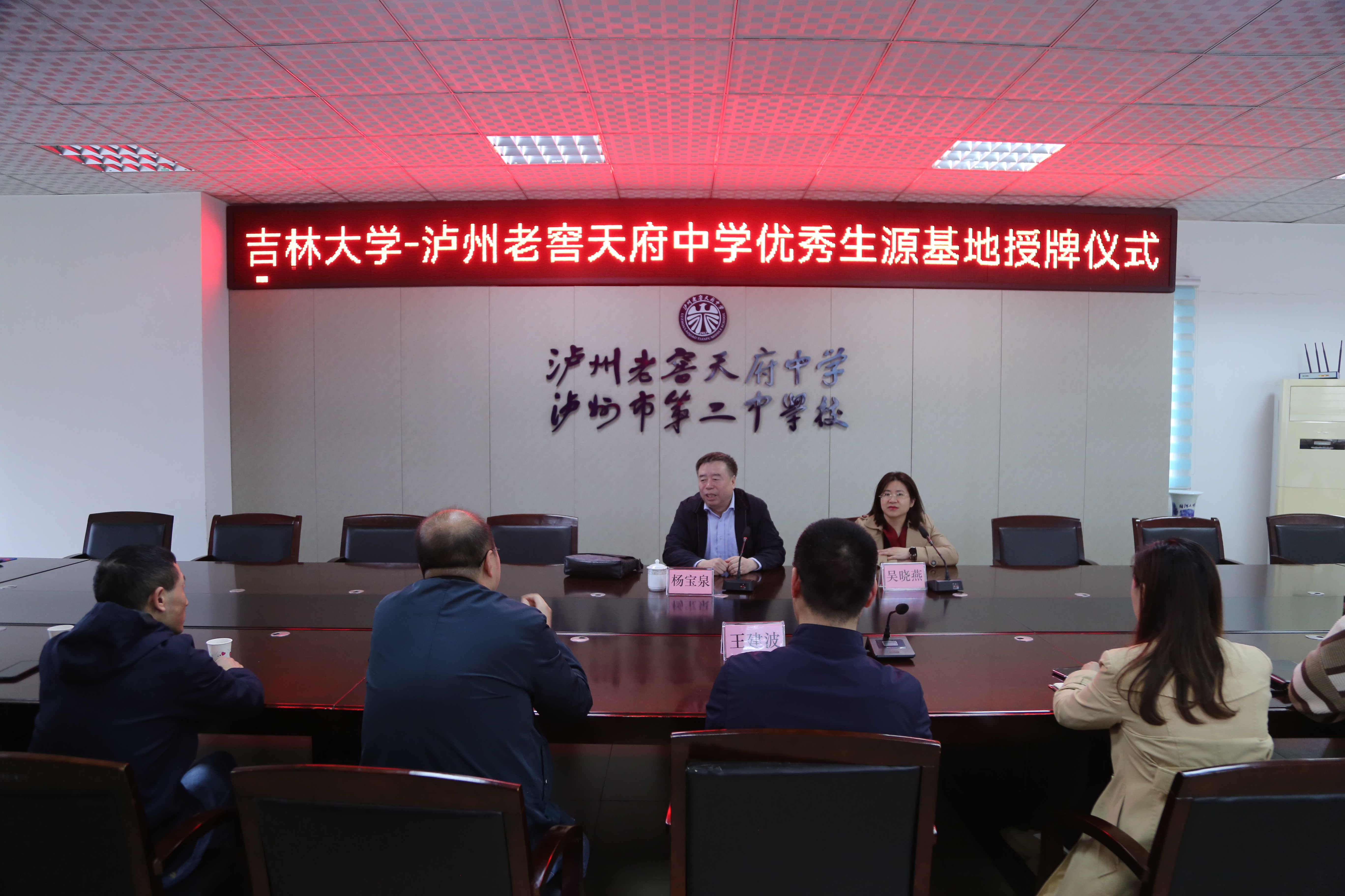 4月8日,杨宝泉书记一行来到泸州市泸州老窖天府中学开展“beat365在线体育官网优秀生源基地”授牌和招生宣讲。杨书记简要介绍了beat365在线体育官网的办学历史、办学特色、学科建设、招生政策等基本情况,并希望两校能够以共建优秀生源基地为契机,进一步加深交流与合作,共同为党育人、为国育才做出更大的贡献。吴晓燕校友结合自己曾经在beat365在线体育官网的学习经历介绍了她对吉大的认识和母校情怀,并且鼓励泸州老窖天府中学的优秀学生积极报考beat365在线体育官网。随后,学院杨宝泉书记代表beat365在线体育官网向泸州老窖天府中学授予了“beat365在线体育官网优秀生源基地”牌,并同该校领导及教师代表合影留念。