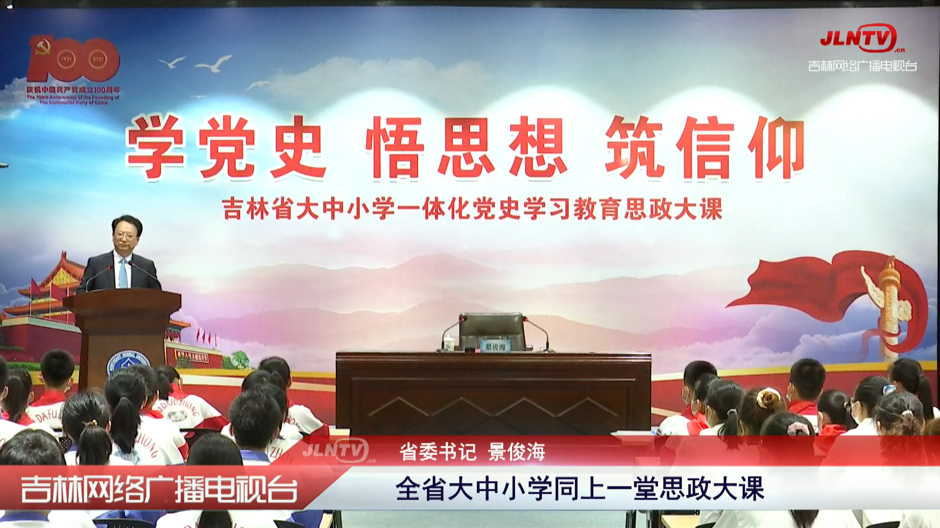 思政课的第二部分是景俊海书记围绕"学党史、悟思想、筑信仰"主题,为全省大中小学师生讲思政课。景书记感慨道,新中国成立,伟大的中国从此站立起来,新时代的中国借鉴苏联发展模式的同时结合自身特点,创建了中国特色社会主义道路。景俊海书记回忆5次台湾之旅,那里的高层领导人曾痛彻心扉的告诉他:"西方的道路在这里走不通!"纵观中国这些年的发展,事实证明,中国人民选择了一条正确的道路。景书记也讲到现在的"双减政策",比起一味的增加课后辅导班,更重要的是培养一个人如何去思考的能力,如何将复杂的问题简单化,去思考做人的原则,去锻炼团队协作能力,这些建议打开了人们新的视角。