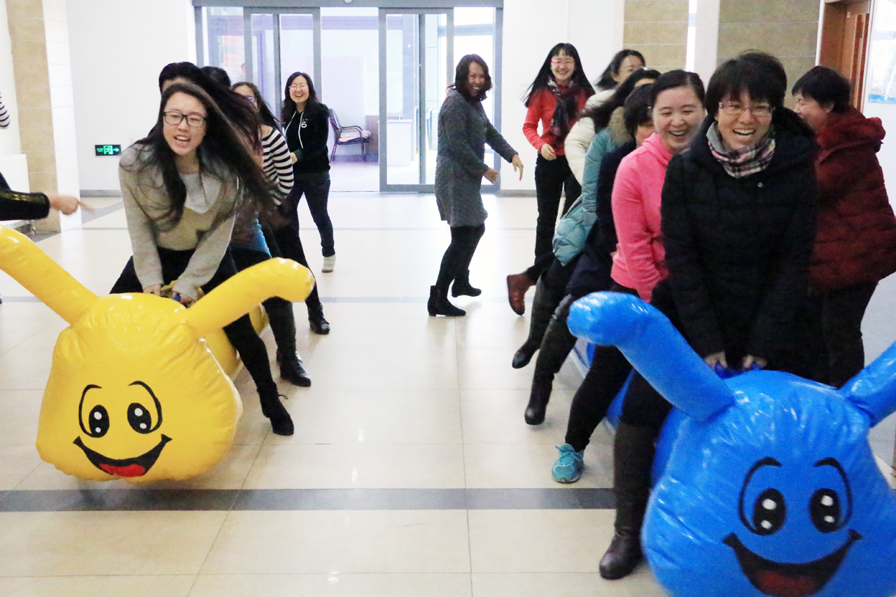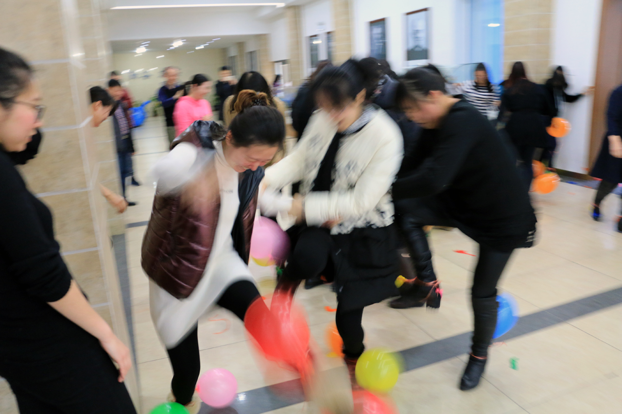 然后女教工们欢天喜地地投入到运动项目中。毛毛虫、踩气球趣味赛,大家玩得热火朝天,把平时的严谨工作作风抛到一边,像孩子一样笑着,闹着,整个活动充斥着童年的快乐。