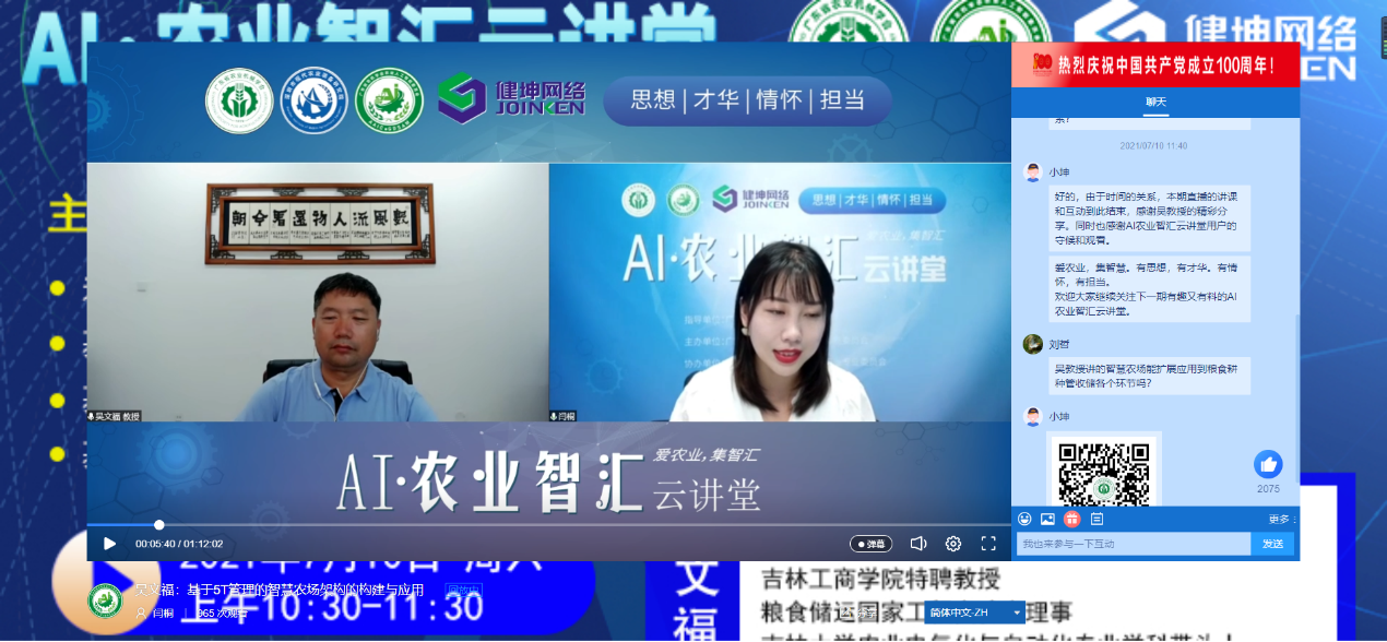 2021年7月10日上午,由广东省农业机械学会农业人工智能委员会主办的AI·农业智汇云讲堂在线上线下直播召开。beat365在线体育官网生物与农业工程学院吴文福教授应邀作“基于5T管理的智慧农场架构的构建与应用”主题报告。来自广州、杭州、北京、南京等800余人全程参与直播学习。