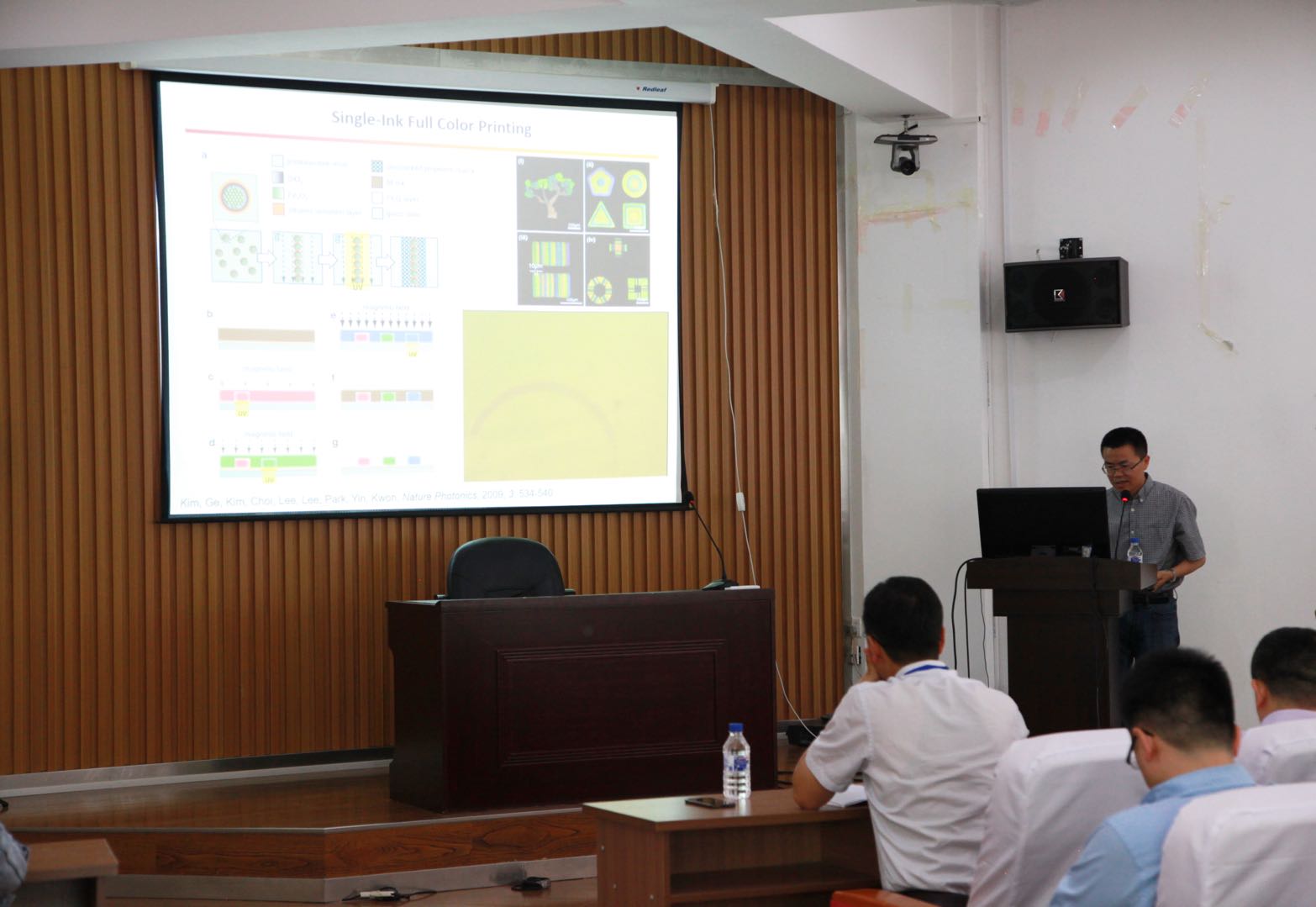 报告会上,殷亚东教授以美国前加州州长施瓦辛格主演的 《Total Recall》 影片中指甲变色的片段为引,从材料的光学性质与结构色出发,深入并详细地讲解了纳米尺度下,智能光学材料的组装与制备,阐述了通过对磁场、电场、PH、压力、温度、湿度等不同刺激的调控,使受体材料发生颜色的转变的各种机制与原理。殷亚东教授对智能光学材料深入研究和讲解,以及会上展示的材料应用概念短片和实验过程动图,开拓了师生视野的同时更丰富了师生研究思路,学术报告精彩纷呈。