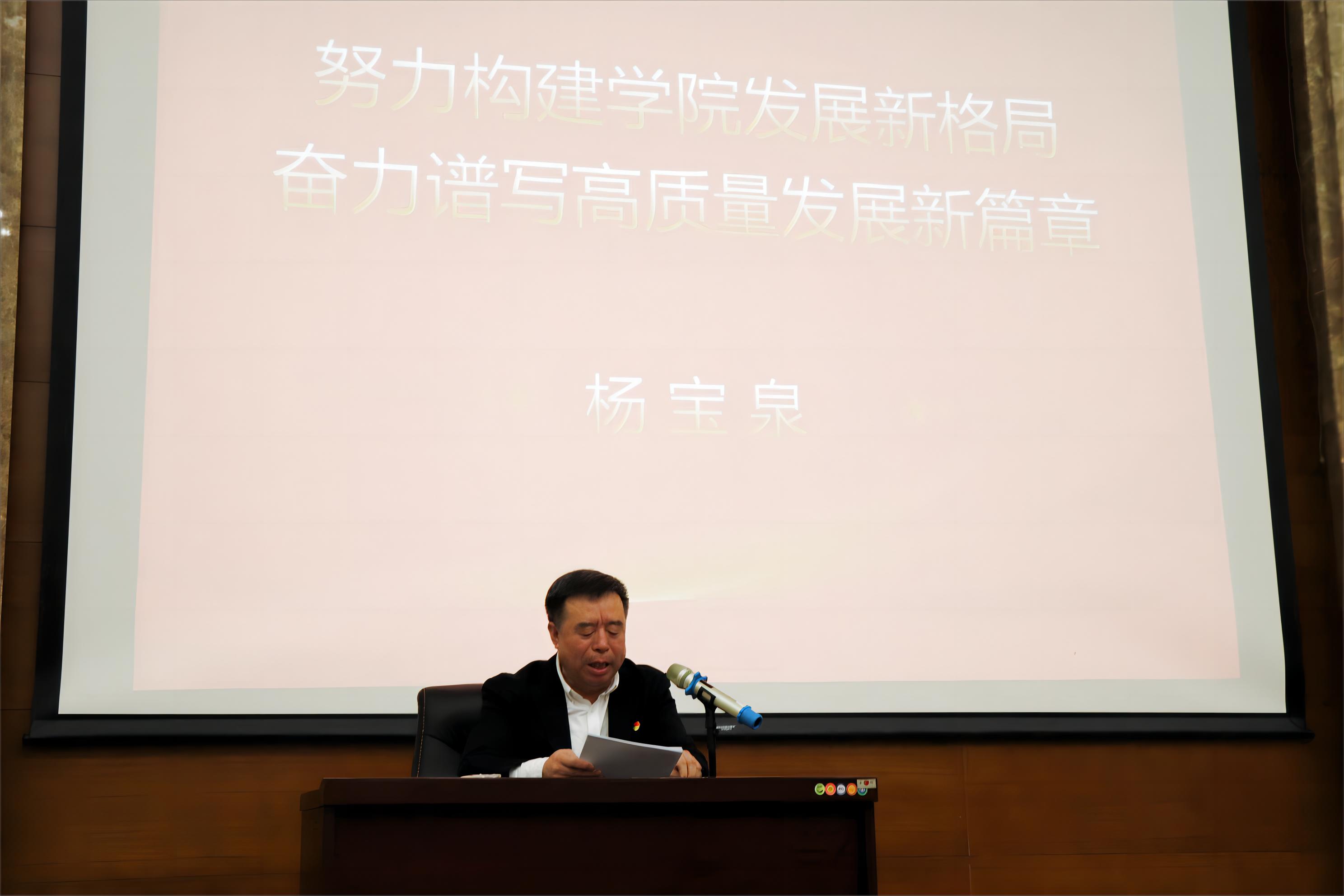 大会在庄严的国歌声中拉开帷幕。学院党委书记杨宝泉同志代表上届党委作题为《努力构建学院发展新格局 奋力谱写高质量发展新篇章》的党委工作报告。报告共一万两千余字,紧紧围绕学院中心工作,从全面从严治党、领导班子能力建设、学科平台建设、人才及师资队伍建设、科研工作、人才培养、学生工作、国际合作、学院机关建设、党风廉政建设及思政工作、校园疫情防控工作、党费收缴使用和管理情况等十二个方面对上届学院党委的工作进行了全面回顾和总结,概括为“两个加强、十个坚持”,实现“两推进、六新、两基、两顺利” 。明确指出了学院工作在建设和发展过程中存在的问题和不足,分析了学院当前所面临的机遇和挑战。报告提出通过十个“坚持”实现“六新四高”,作为未来五年的工作思路和奋斗目标。大会号召全院党组织和全体党员,坚持全面贯彻落实“新时代党的建设总要求”,加强党对学院工作的全面领导,不断开创全面从严治党向纵深发展新局面;坚持“深化改革、全面推进”总基调,构建事业发展新格局;坚持“以学科建设为主线”总方针,实现各项事业高质量协同发展新目标;坚持提升素质能力,实现高水平人才队伍新跨越;坚持开展有组织科研,打造高水平科学研究新高度;坚持推进“平台工程”建设,打造科研平台新高地;坚持提升人才培养能力,培养各层次高质量人才;坚持高水平开放办学,实现高质量的国际合作;坚持抓好师德师风建设,打造高质量的师资队伍;坚持软硬兼顾,提供高质量的支撑保障工作。在每一个方面总共罗列出50个具体的工作方向及预计实现的目标。
