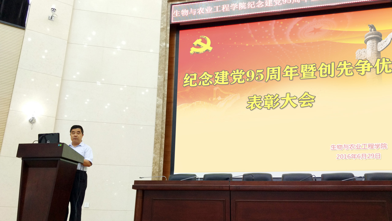 为庆祝中国共产党成立九十五周年,深入开展“两学一做”学习教育,使广大党员加强党性修养,增强党员意识,培育和践行社会主义核心价值观,立足岗位,发挥先锋模范作用,2016年6月29日下午2时,生物与农业工程学院党委在仿生楼报告厅召开了庆祝中国共产党成立九十五周年暨“创先争优”表彰大会。学院全体党员参加了大会,会议由院党委副书记曲贵文同志主持。