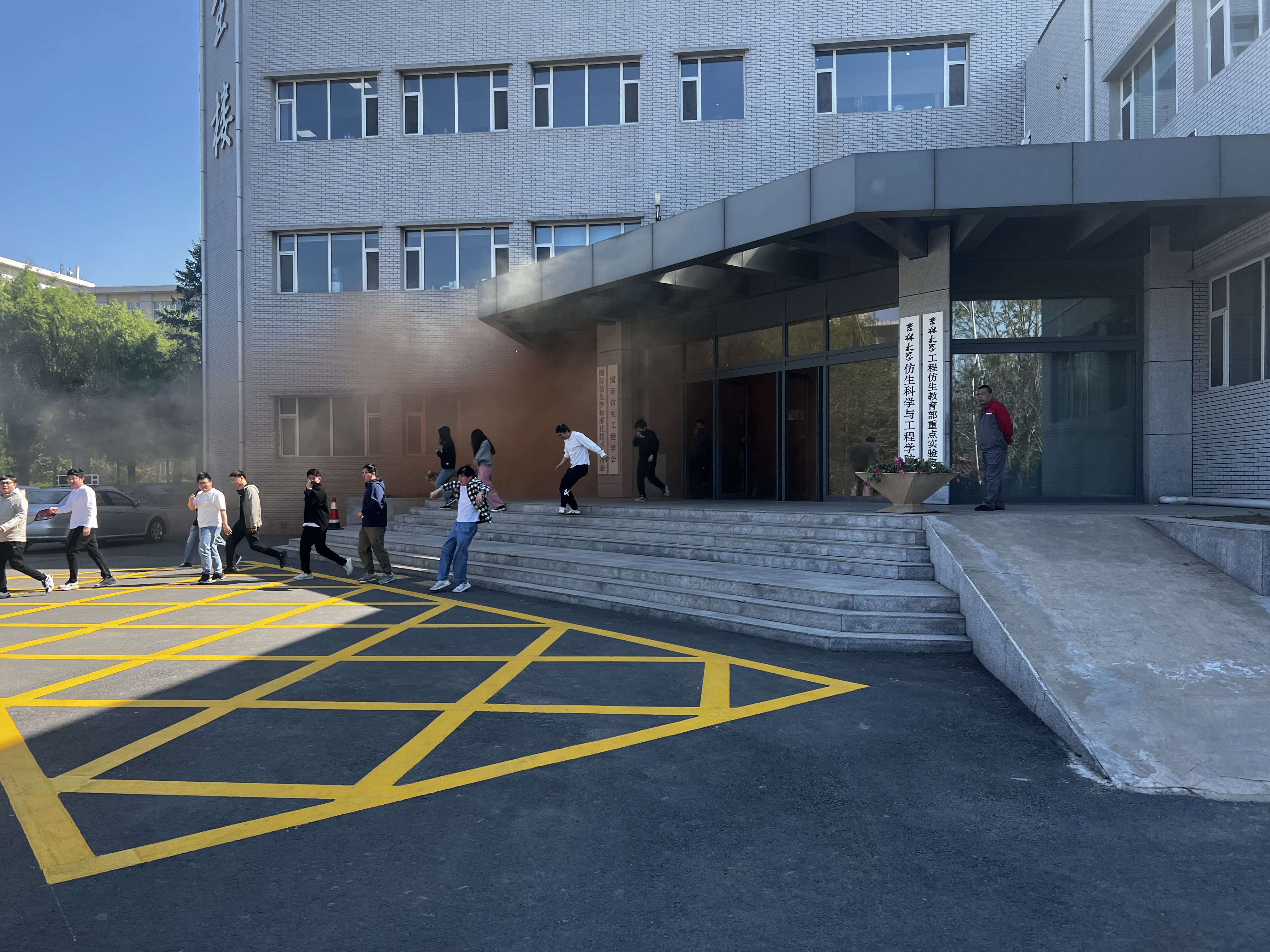 演练开始,交通馆、仿生楼内的师生沿着指定的疏散通道快速前进,有序撤离到学校教学楼前的安全地带,整个逃生过程迅速而有序。东区保卫办公室消防科王中刚科长对此次疏散演习中师生的表现给予了肯定,同时对部分同学演习中出现的问题进行了正确的指导。