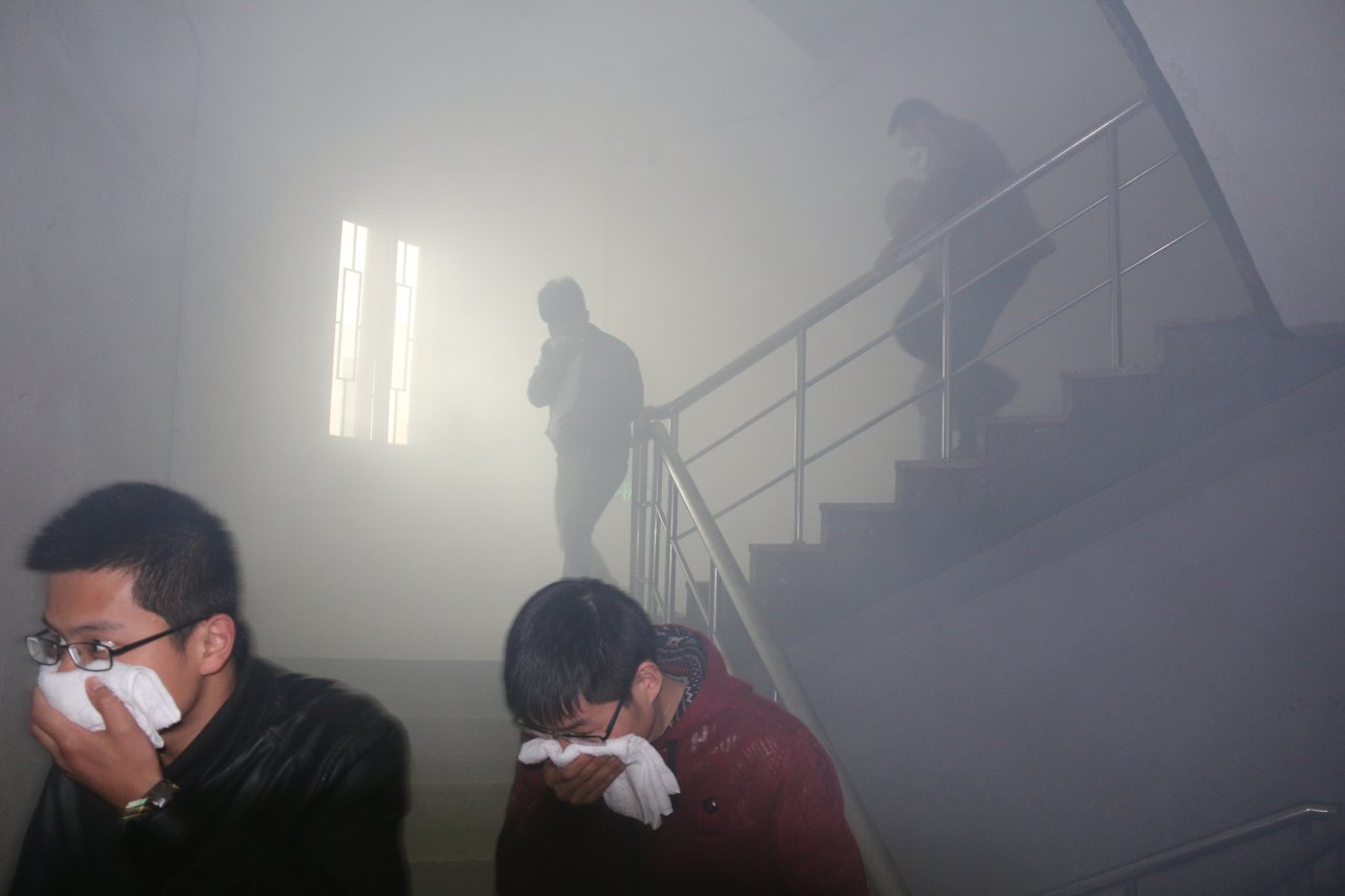 14:30,楼内模拟火灾现场浓烟滚滚,火灾警报按疏散演练方案响起,师生员工约150人以三折八层的潮湿毛巾掩住口鼻,经由两侧楼梯疏散,五分钟内到楼外集合完毕。