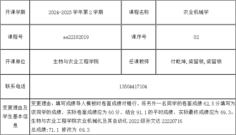 关于学院2022级孙文达同学农业机械学课程成绩更正的公示