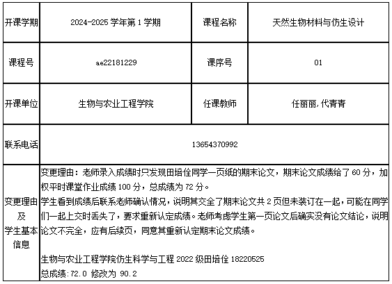 关于学院2022级田培佺同学天然生物材料与仿生设计课程成绩更正的公示